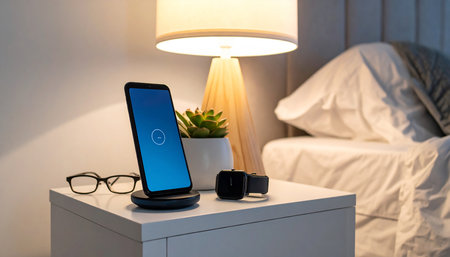 smartphone on the bedside table with glasses and a table lamp