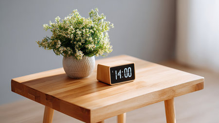 A stylish wooden table features a sleek alarm clock and a vibrant potted plant, creating a serene and minimalistic atmosphere. Perfect for enhancing interior design.