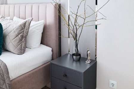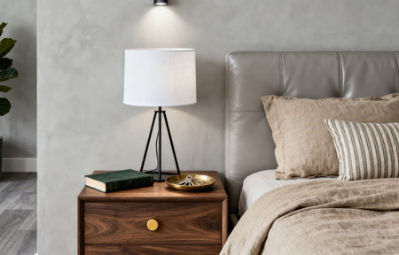 An Elegant Bedroom Featuring a Modern Nightstand and Stylish Decorative Elements Throughout