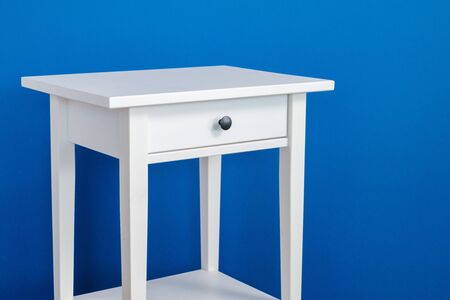 White wooden nightstand table against blue wall
