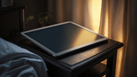 Tablet resting on a bedside table with soft sunlight filtering through curtains in a cozy bedroom environment