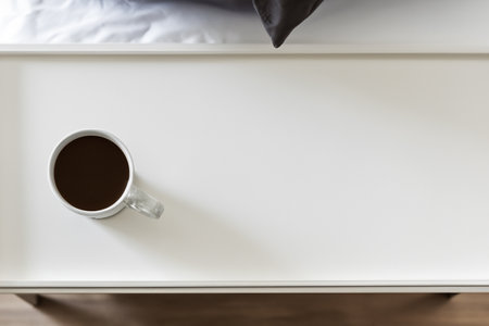Coffee cup on bedside table in hotel room, stock photo