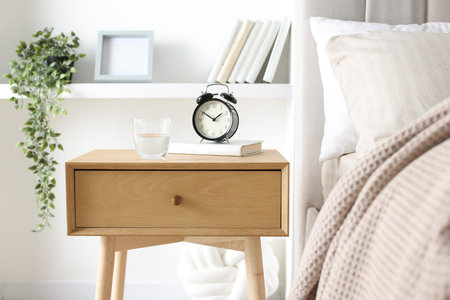 Bedside table with alarm clock, glass of water and book near bed indoors