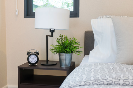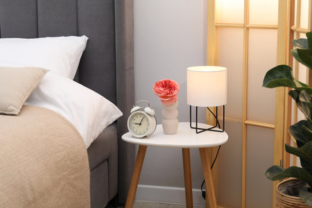 Side table with lamp, alarm clock and flower near bed indoors