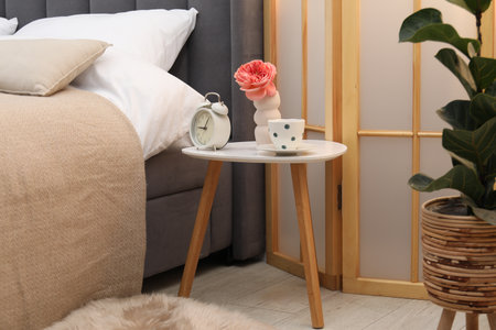 Side table with alarm clock, cup of tea and flower near bed indoors