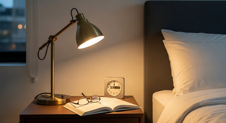 A cozy nightstand scene featuring a lit lamp, an open book with reading glasses, and a mug. The warm lighting creates a relaxing atmosphere perfect for evening reading in a bedroom.