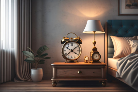 Vintage alarm clock on bedside table in bedroom. 3d rendering