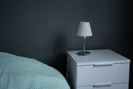 Bedside table with lamp. Hotel room, apartment.