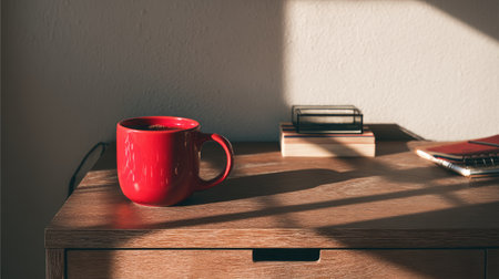 A vibrant red coffee mug sits on a wooden table, bathed in soft sunlight that casts long shadows, creating a warm and inviting morning atmosphere.