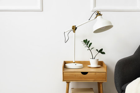 Stylish interior with bedside table and armchair on light wall background