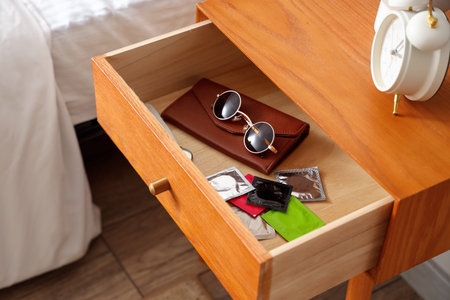Open drawer with condoms and accessories in bedroom, closeup