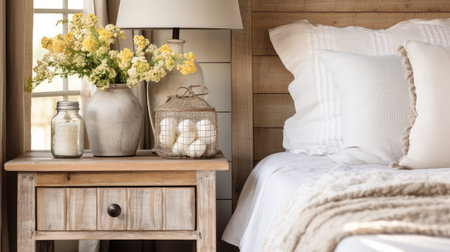 Bedroom interior with flowers in vase and wooden bedside table