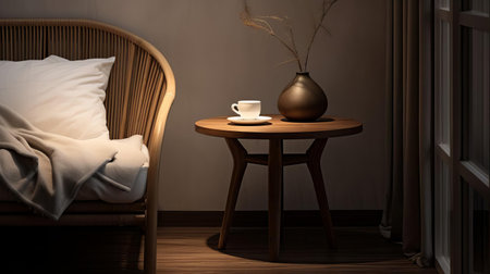 Cozy bedroom corner with warm lighting, a vase of flowers, and a cup of coffee on a wooden nightstand