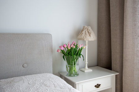 Beautiful pink tulips in vase on bedside table in bedroom