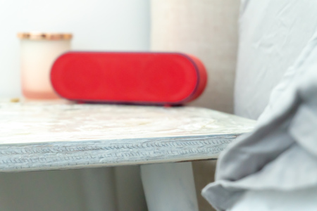 Bright red radio alarm clock and candle jar on a bedside table nightstand, with bed and linens showing in soft colors.