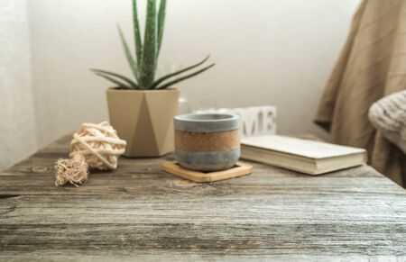 Home interior with decorative items on a wooden table. The concept of comfort and decor.