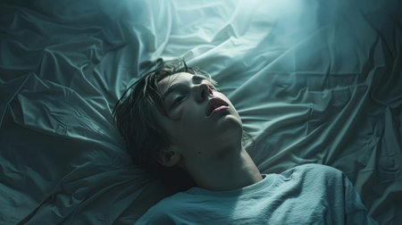 A youth lies in bed, gazing at the blank ceiling, their face reflecting emptiness and despair. The dimly lit room adds to their sense of isolation.