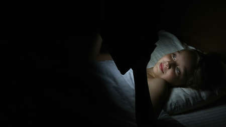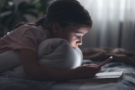 Kid addiction. Digital leisure. Night internet surfing. Happy smiling girl scrolling social media feed on smartphone lying in bed in dark room at home.
