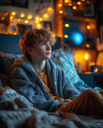 A young man lies in bed with a cold, looking contemplative while surrounded by soft pillows and warm light, capturing a moment of serene relaxation.