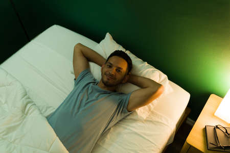 I love my bed. Cheerful young man smiling and feeling relaxed while resting in his bedroom at night