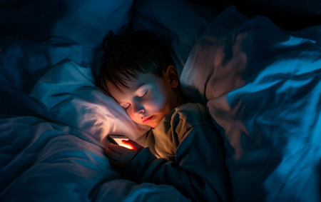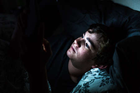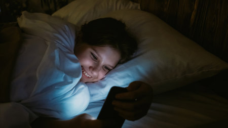 Young Boy Laying in Bed With Cell Phone, Daily Life of a Modern Child