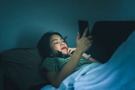 Close-up portrait of her she nice attractive cheerful cheery girl lying in bed chatting online using 5g app modern web in dark black illuminated room house hotel flat indoors