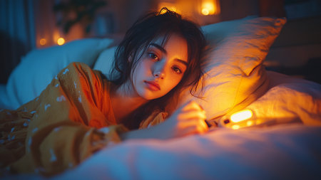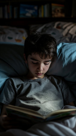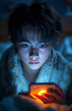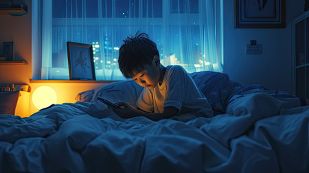 a Chinese boy engrossed in his mobile phone while lounging in bed, the soft glow of the screen illuminating his face, highlighting the allure of modern technology in everyday life