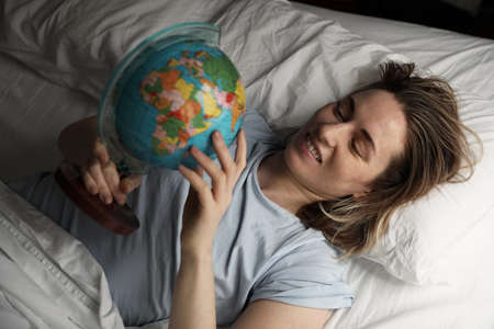 Close-up portrait of woman laying in bed and holding globe. Horizontal.