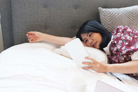 Smiling Asian young woman is laying on white bed holding tablet for online working and shopping with laptop in social medea in bedroom. Businesswoman work from home with Technology concept.