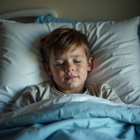 A young boy lies in a hospital bed, covered with a light blue blanket. He appears calm and contemplative, embodying resilience amid his health challenges. Generative AI.