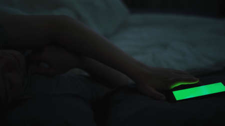 Young man waking up with mobile alarm clock with green screen early in the morning. Sleepy guy waking up after hearing alarm clock signal on smartphone, reaching for ringing mobile phone with chromakey and using it.