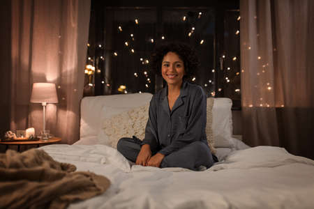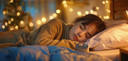 A young woman sleeps soundly in bed, with Christmas lights twinkling in the background.