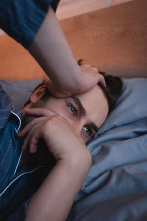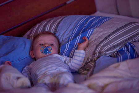 Sad child laying in bed with thermometer in his mouth. Temperature measurement. Sick boy on bed late at night