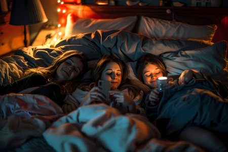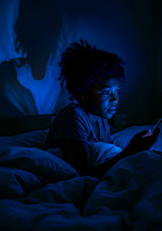 Teen in dimly lit room engrossed with phone, immersed in digital world, oblivious surroundings