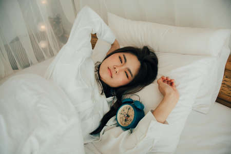Morning routine. Young pretty woman wake up at home. Bed time. Snooze alarm. Lazy lifestyle female portrait. Bedroom apartment. Early time. Asleep concept