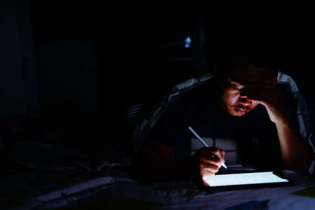 man using tablet to reading in bed and turning off the lights before getting some shut-eye sleep. working on bed