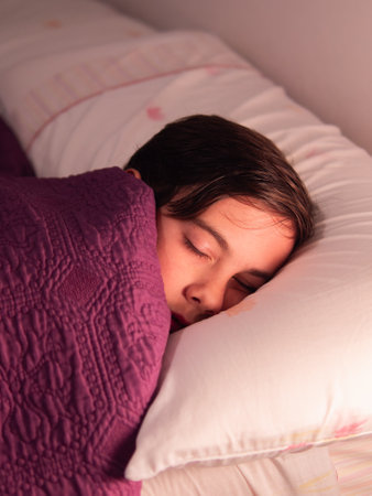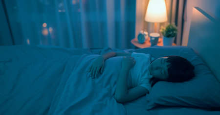 Five years old child sleeping in bed. Boy lying with closed eyes at night