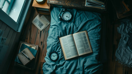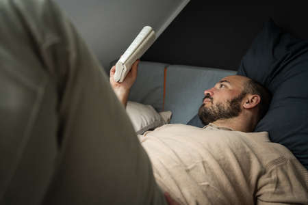 Cozy bedroom scene with man reading book under soft night light perfect relaxation peaceful reflection.