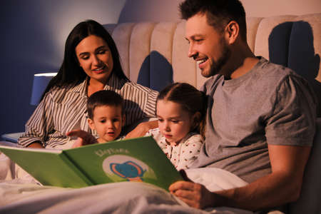 Before go to night or daytime sleep mother reading to daughter fairytale, kid enjoy storytelling lying with mommy in bed feels comfortable, good pastime develop reader skill, have fun at home concept