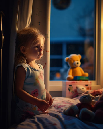 Generative AI : child girl in pajamas is sad on Christmas morning by the window