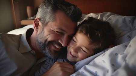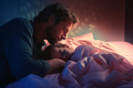 Generative AI : the Happy family father and child baby daughter sleeping in bed