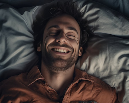 Lost in thoughts Top view of handsome young man in shirt and tie holding hands behind head and smiling while lying in bed : Generative AI