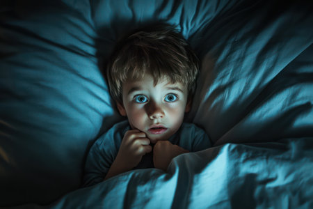 Frightened little boy hides under his blanket, afraid of monsters in the dark, visualizing childhood nightmares and fear of the unknown.