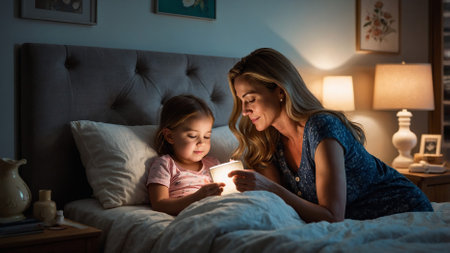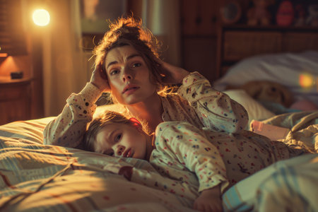 A heartfelt scene of a woman and child in cozy pajamas sharing a peaceful moment in a dimly lit bedroom evoking warmth.
