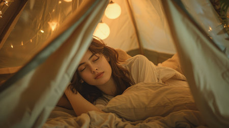 20-year-old women sleeping inside a camping tent. Concept of outdoor holiday, dating, mountaineering, tourist recreation and sport. Generative ai.