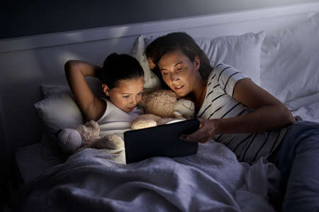 Doing story time a little differently. Shot of a mother and her little daughter using a digital tablet together in bed at night.