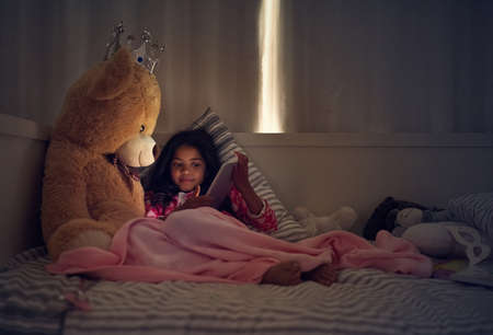 Enjoying a movie with her teddy. Shot of a little girl using a digital tablet while lying in bed with her teddy at night.