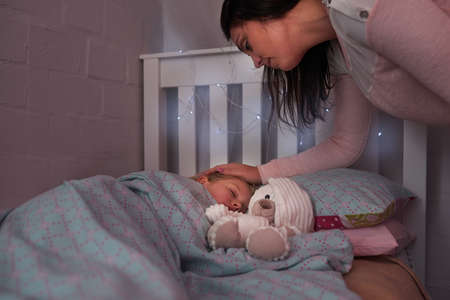 A caring mother tucks her sleeping daughter into bed under a star-themed blanket in a cozy, dimly lit room. The scene evokes warmth, maternal love, and the peacefulness of a bedtime routine.