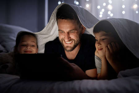 Whether its day or night, they stay entertained. a father and his two little children using a digital tablet together in bed at night.