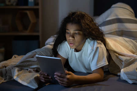 Curious African American girl with wavy hair lying under duvet in bed and using tablet in dark room